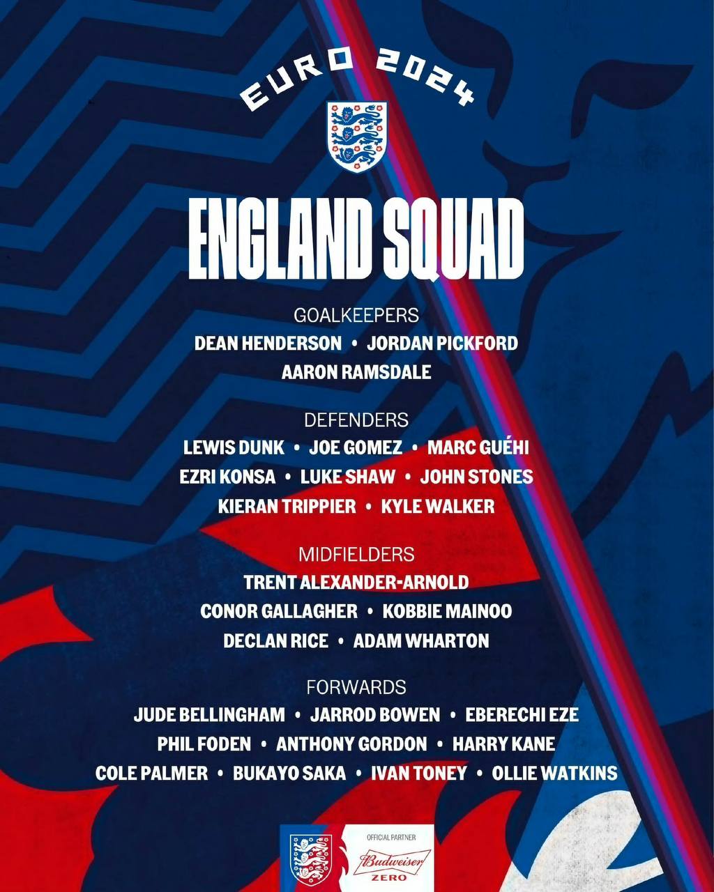 北京时间6月7日凌晨,英格兰男足公布了参加欧洲杯的26人最终参赛名单。凯恩、贝林厄姆、赖斯、萨卡、福登等名将顺利入围!